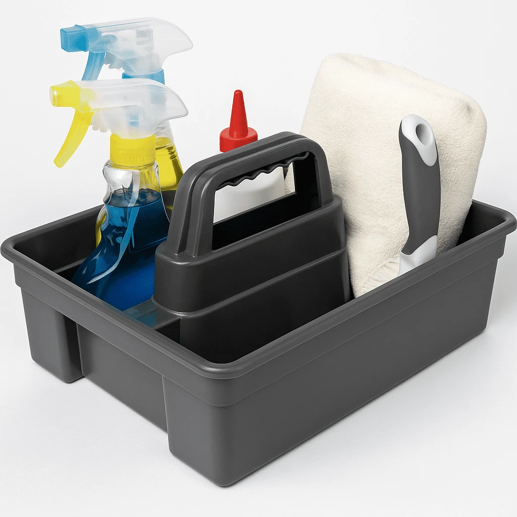 Designed with a strong central handle and multiple compartments, it allows easy organization and transport of sprays, cloths, brushes, and other cleaning tools.